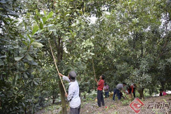 在大雪山乡的坚果种植基地里,村民字东发正和同伴们在采摘成熟的澳洲坚果。他用一端安装了铁钩的竹竿连勾带敲,绿色的澳洲坚果雨一样落在树下。其他人则顺着树下搜寻,将落下的果子捡起来装在麻袋里。