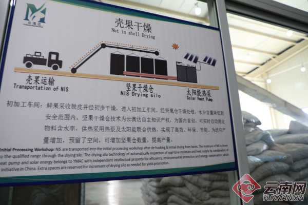 脱壳后的澳洲坚果含水量超过20%,必须及时送到初加工车间进行干燥。初加工在这里采用的是坚果干燥仓技术,利用热泵和太阳能联合加热,节能环保。还能自动测定干燥仓内的澳洲坚果的含水量,调整供热强度,确保品质。据了解,该项技术由云澳达公司自主研发,在世界上都居于领先位置。