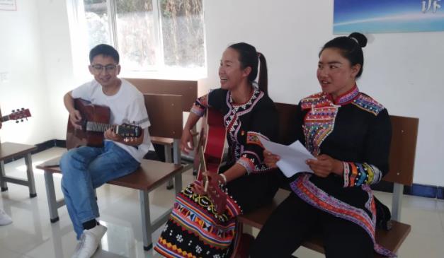 在腾龙村文艺骨干培训中,村民沈有凤学得格外认真,她一会儿学跳拉祜舞蹈、一会儿学敲象脚鼓、一会儿又学习拉祜歌曲吉他弹唱……