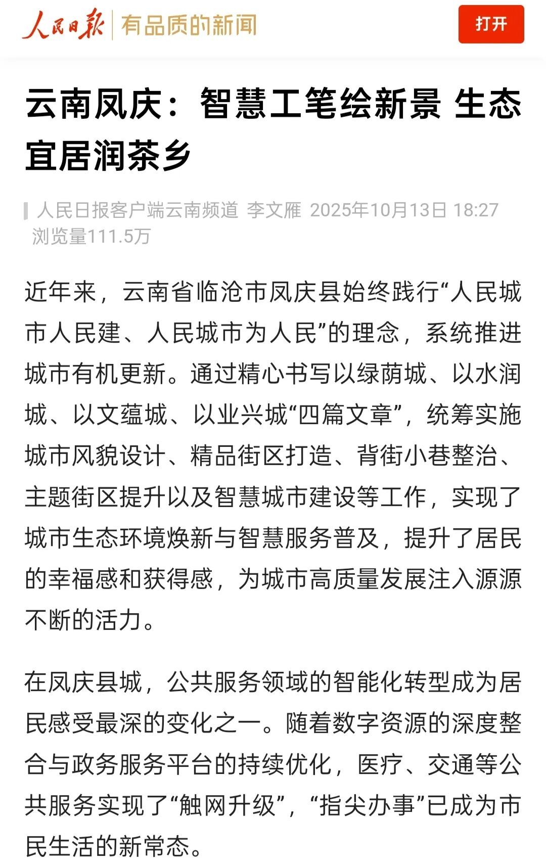 原标题:央媒看临沧 | 人民日报客户端点赞凤庆城市工作
