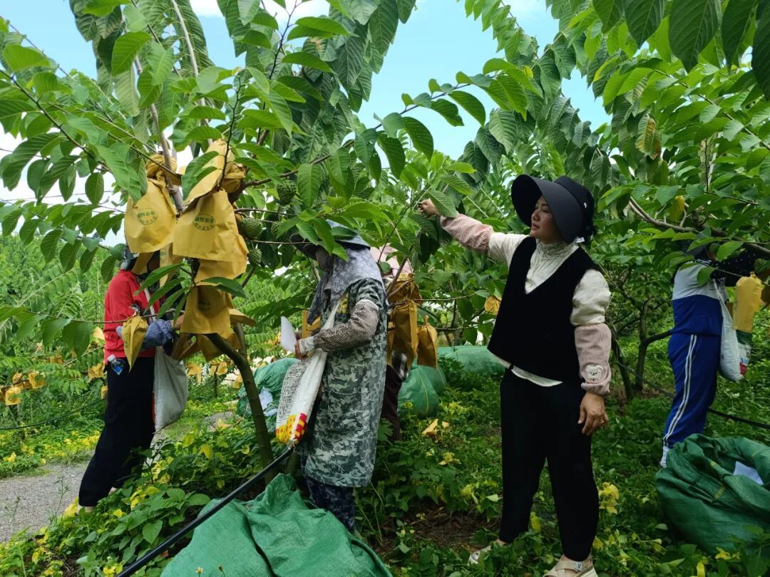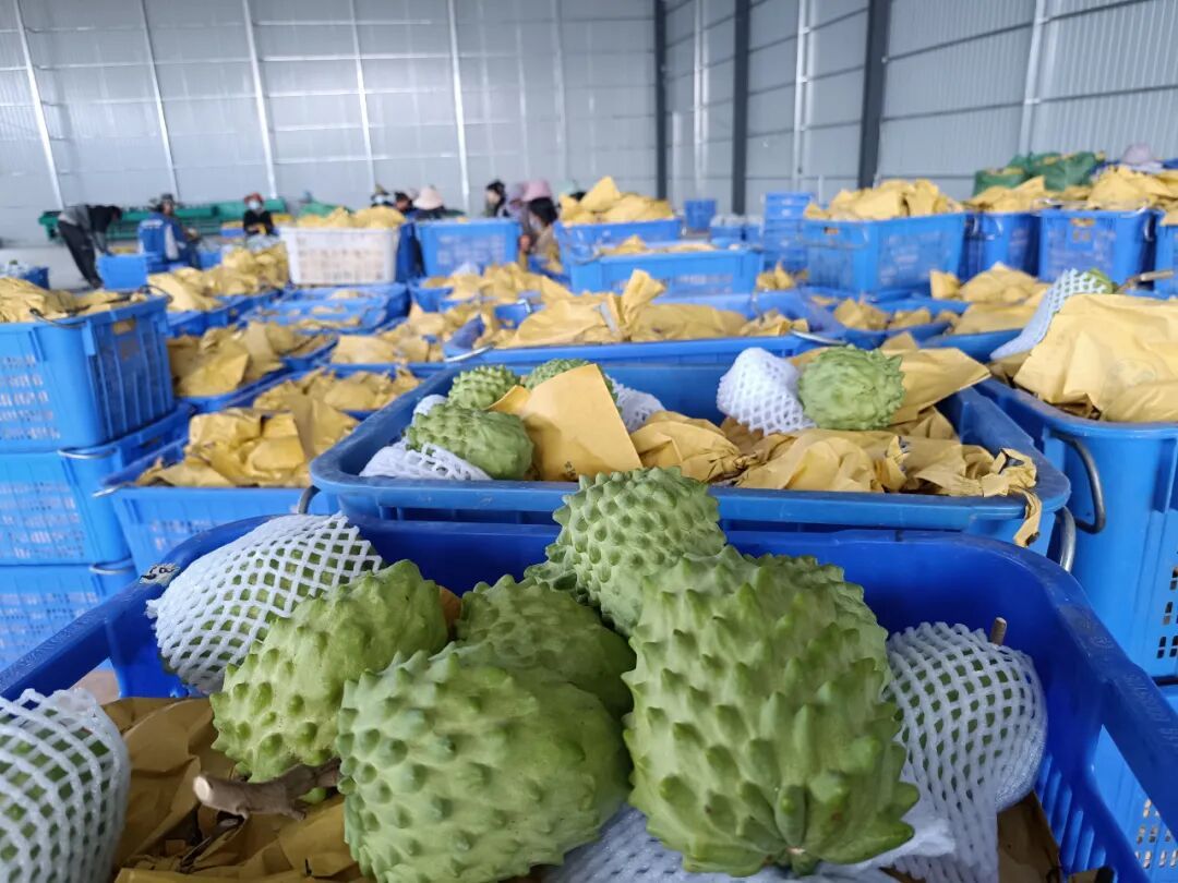 2019年,第一批释迦果成功挂果并产生效益;2021年,销售收入突破352万元,2022年攀升至425万元,产量和收益连年呈现良好态势。随着基地的不断发展,公司常年吸纳30余名村民稳定就业,季节性用工峰值超过100人,每年发放工资超过150万元。同时,辐射带动勐勐村30余户农户种植释迦果500余亩,不仅免费提供种苗和技术指导,还建立了“保底价收购 + 利润分红”机制,确保农户每亩收益不低于8000元。