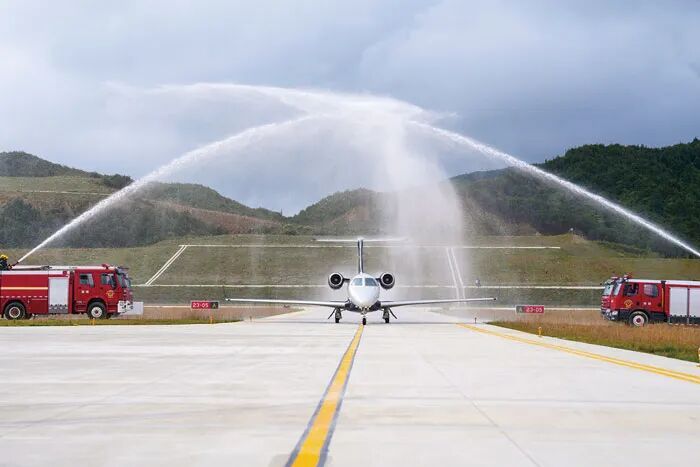 2023年9月26日,一架七彩通航飞鸿-300飞机平稳降落在凤庆中和机场,并缓缓通过“水门”,标志着凤庆中和机场正式通航。