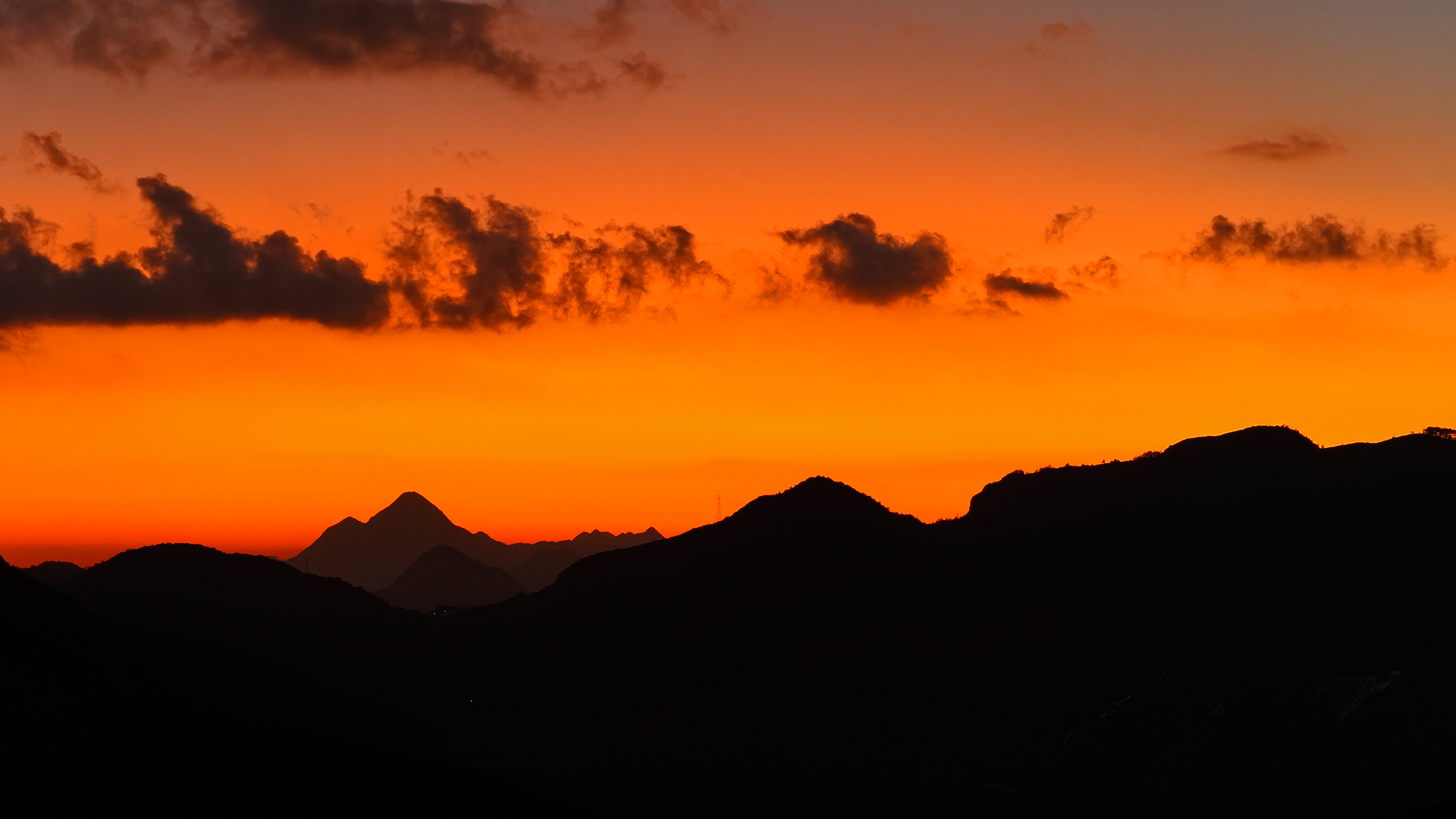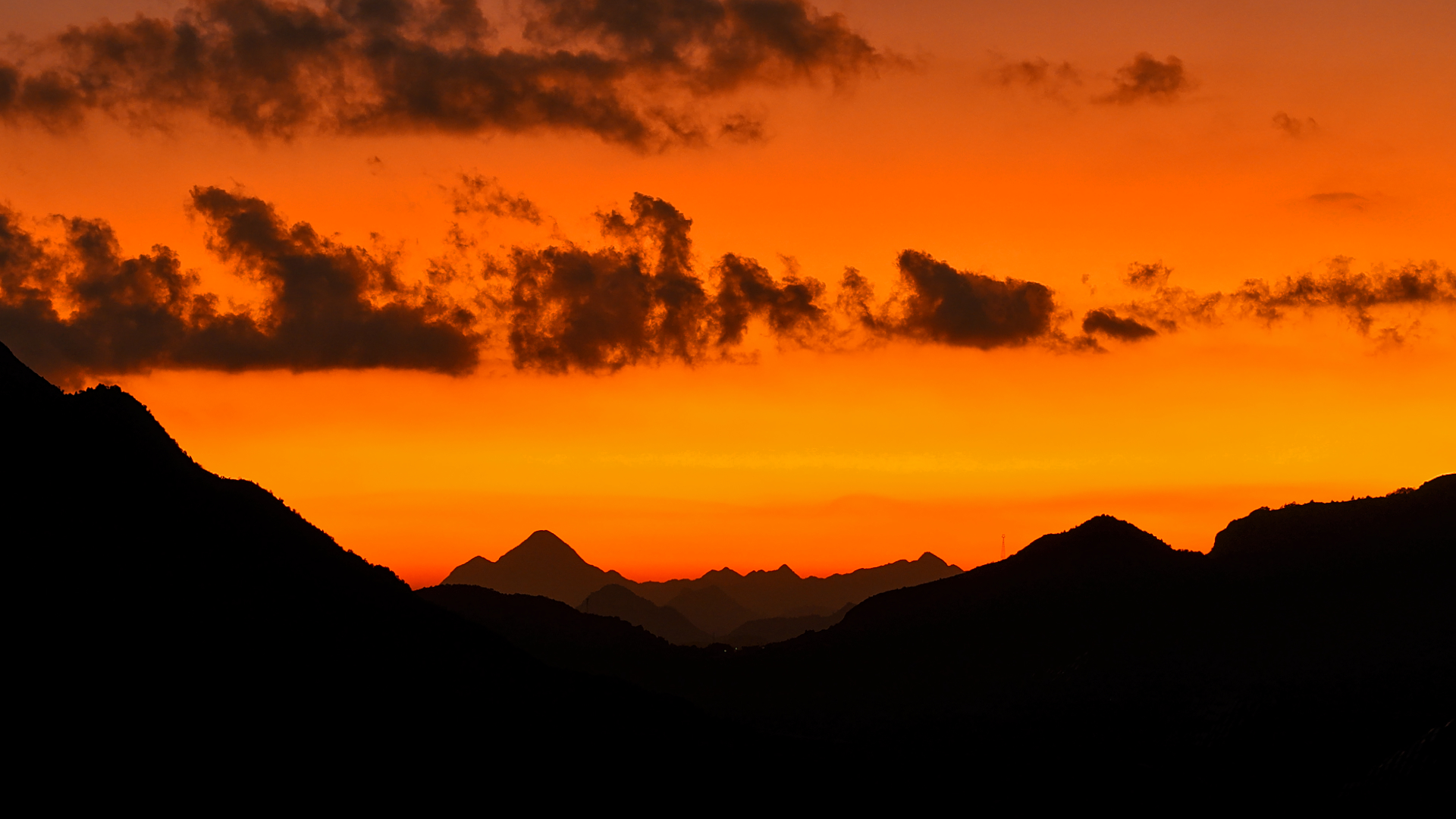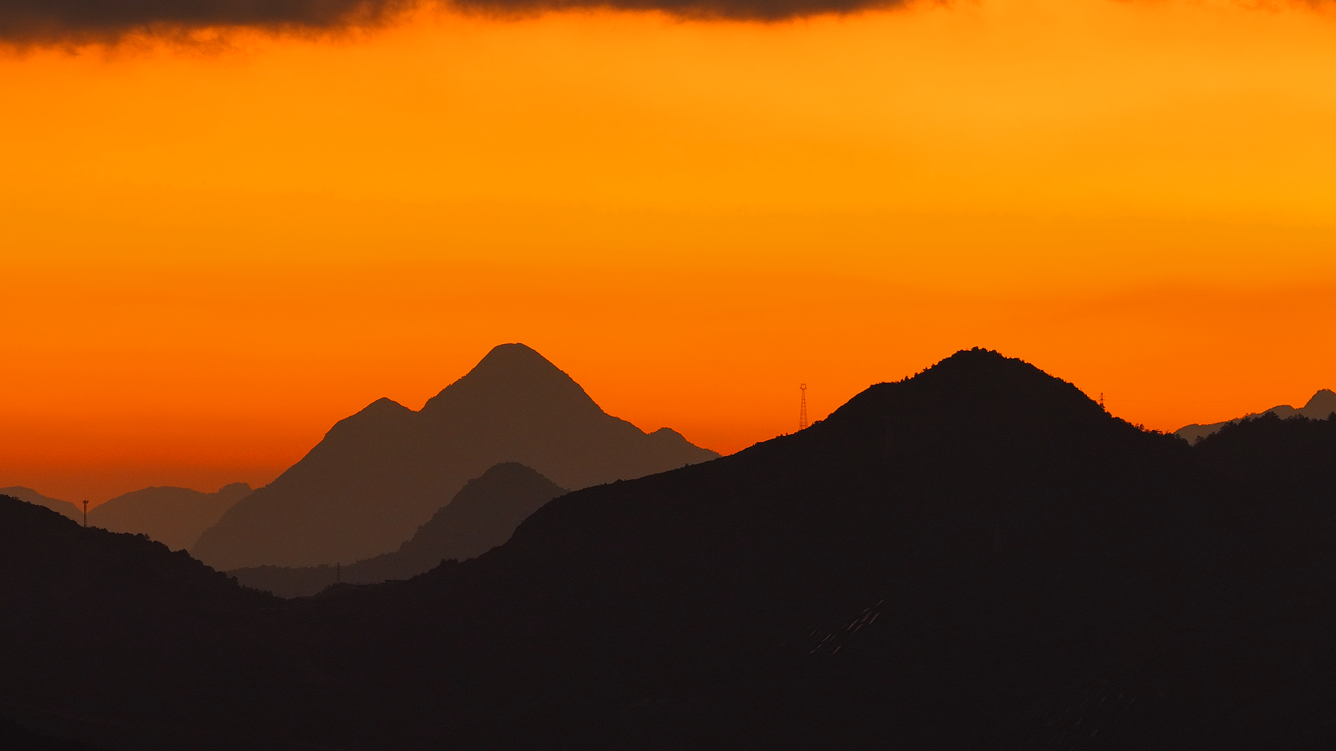 与此形成鲜明对比的是近处与远方的山峦。暮色中,山的剪影由青黛转为墨黑,层次分明,如一道道波动的曲线,坚实而沉默地托举着这片绚烂的天空。光影之间,高耸的山脊线与漫天的暖色形成了强烈的视觉冲击,既展现了自然的雄浑俊美,也透露出一种宁静而永恒的诗意。