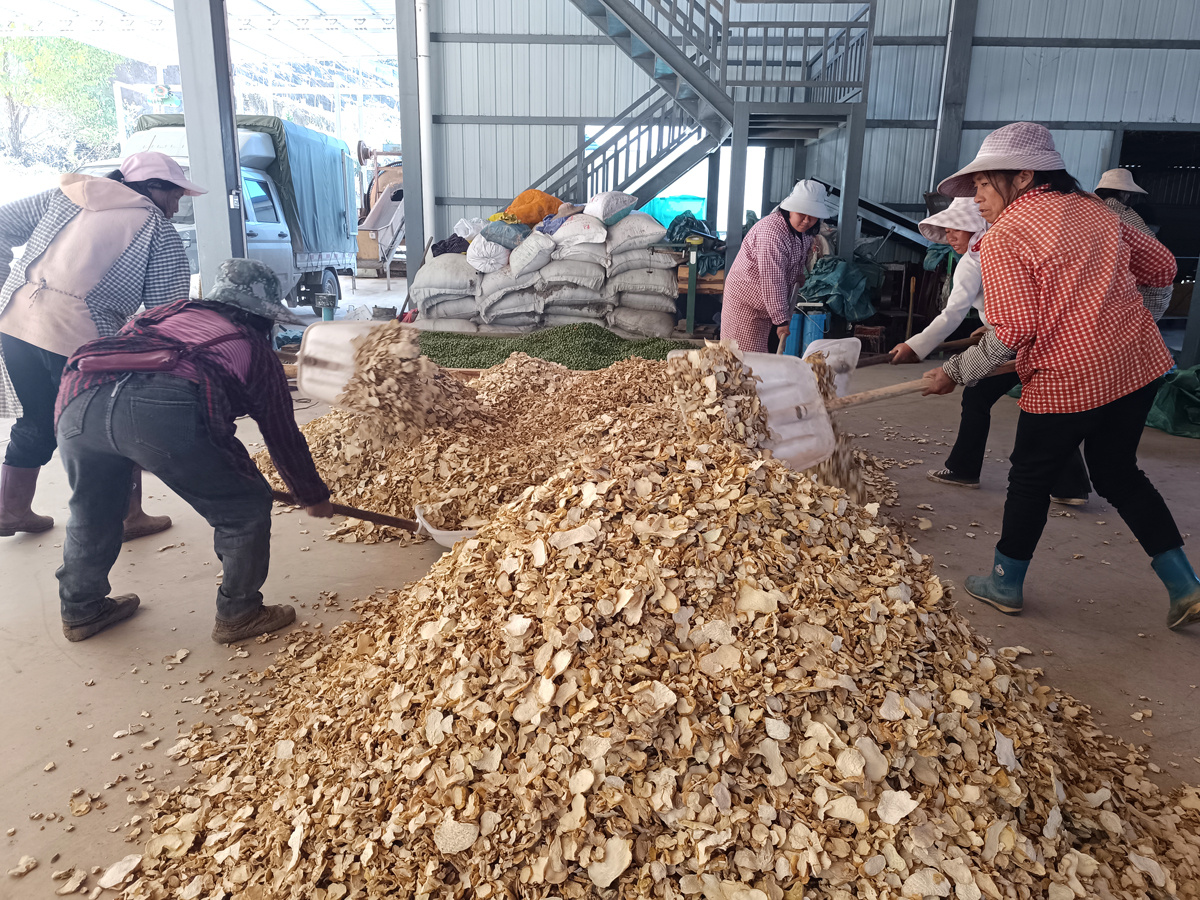 眼下正值滇黄精采收旺季,云县涌宝镇石龙村乐家组的田间地头与加工车间里一派火热景象。临沧有乾农业科技有限公司的初加工生产线上,刚采收的黄精鲜品堆积成小山,工人们默契配合,清洗、搬运、切片、烘干、包装等工序有条不紊。新鲜饱满的黄精在标准化流程中逐步转化为可食可药的优质干品,完成了从农产品到高价值商品的“华丽转身”。
