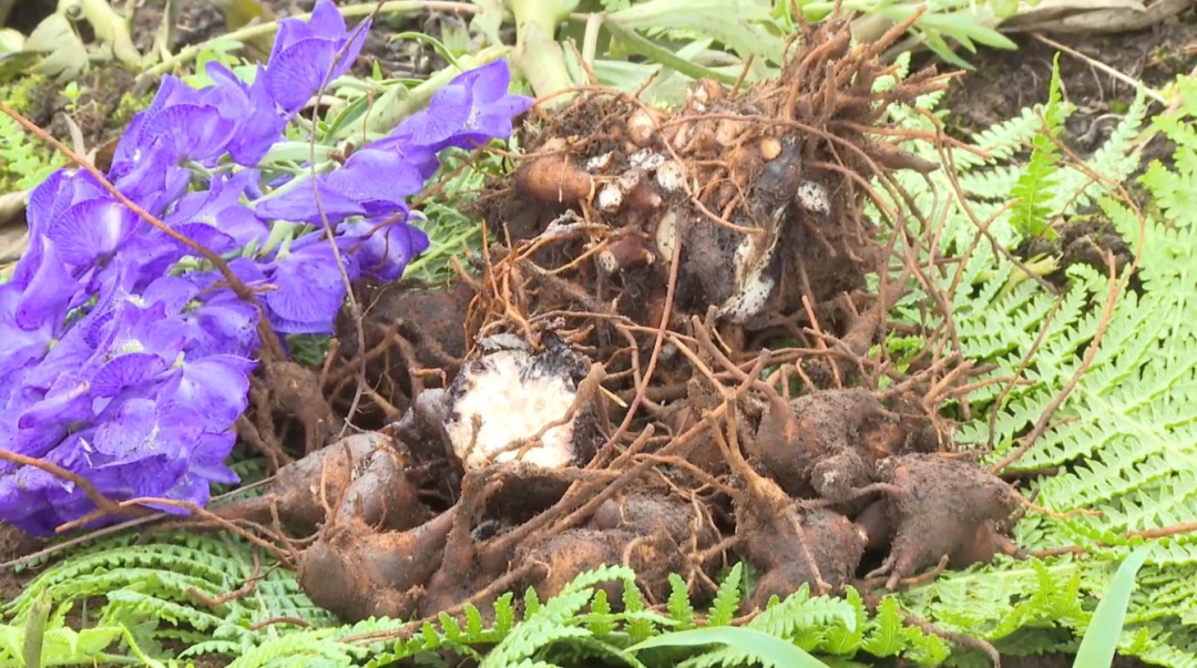 在洛党镇琼岳村的中药材种植基地,村民俯身田垄,手中的耙子一起一落,一个个饱满的附子根块破土而出。他们动作娴熟地抖掉根块上的泥土,随后进行分拣、装袋,脸上洋溢着收获的喜悦。