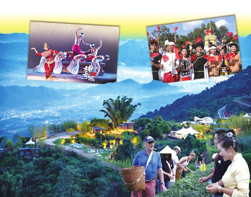 耿马县民族歌舞团《战神》剧照。 临沧各民族团结和睦共同发展。 镇康县赐福彝寨。 中外游客在云顶庄园体验采茶。
