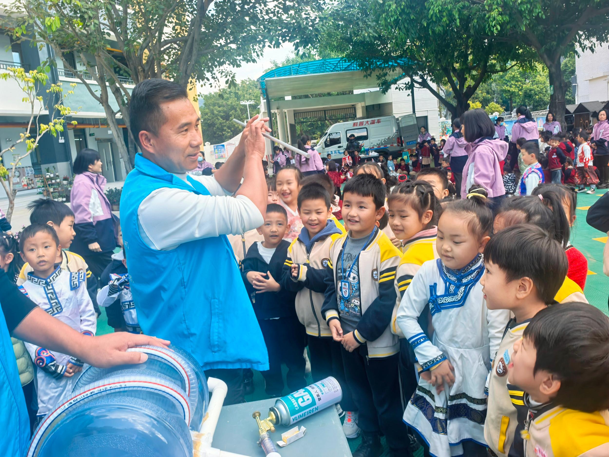 科学实验演示环节更是热闹。鸣棒实验中,老师轻轻摩擦鸣棒,清脆的声响瞬间抓住了孩子们的注意力,一个个孩子瞪圆好奇的眼睛;等离子炮启动时,奇妙的现象让现场惊叹声此起彼伏。孩子们紧紧围着老师,小嘴巴里不断蹦出“为什么”“怎么做”的疑问,还争先恐后地举起小手,迫切想要亲手体验实验的乐趣。