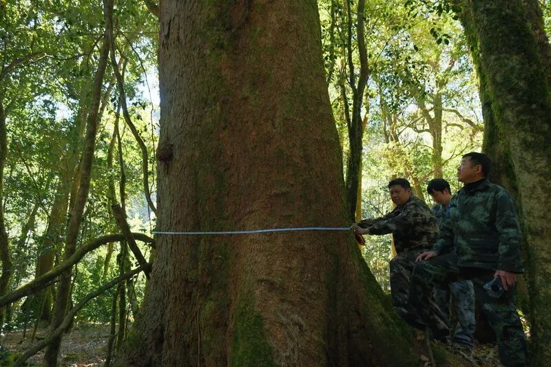 这片珍贵的茶果樟群落,隐逸于大雪山片区海拔2300至2700米的山林深处。这里空气湿润,土壤腐殖层丰厚,成片的高大乔木挺拔参天,枝叶交织成荫,为茶果樟提供了绝佳的生长环境。据临翔管护分局高级工程师孙中国现场介绍,这株“茶果樟王”胸径实测为221.0厘米,需四五名成年人方能合抱,根据生长状况推算,其树龄已近千年。