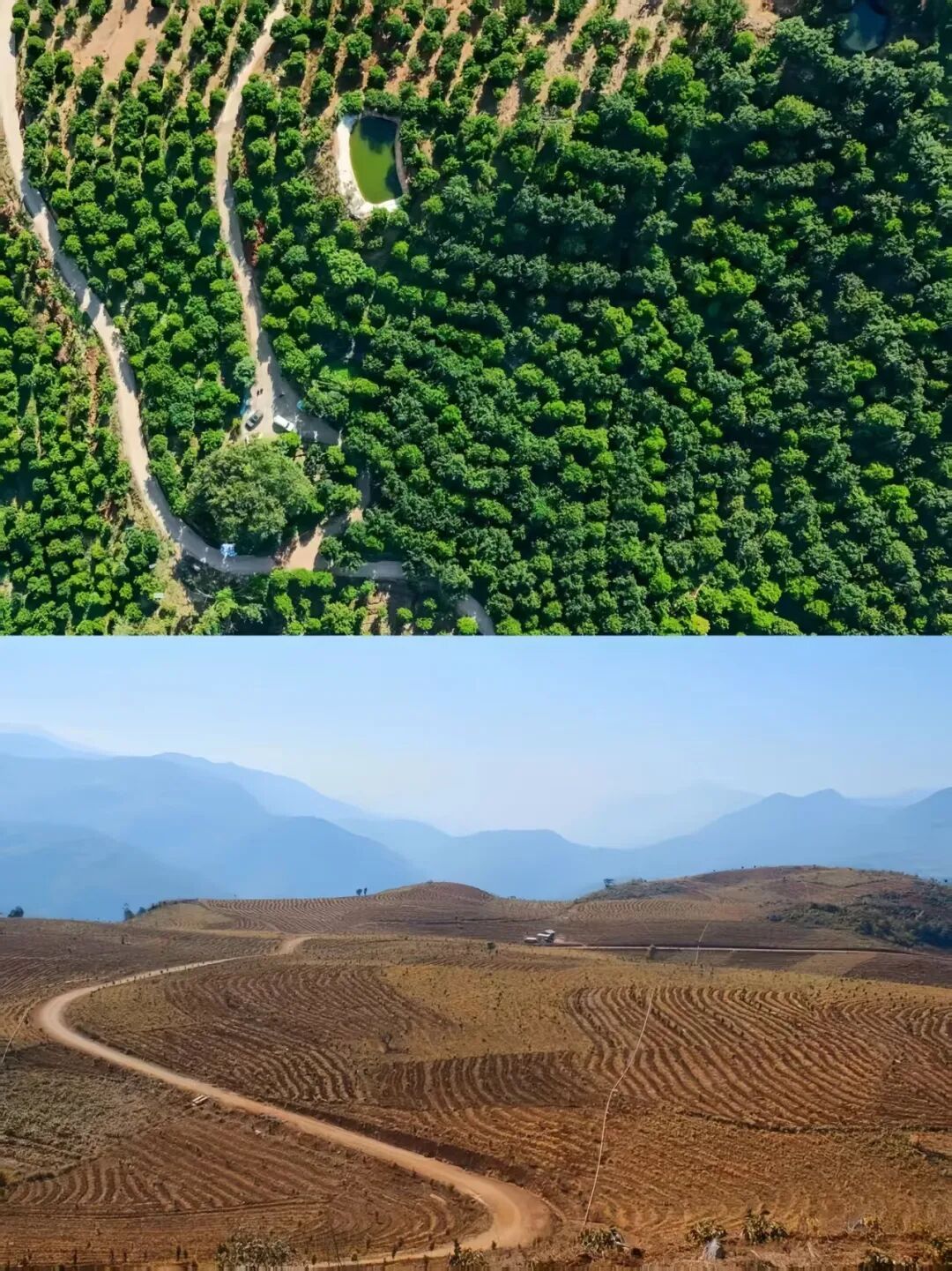 这是一张拼版照片。上图:2026年1月6日拍摄的临沧市永德县坚果树种植林(无人机照片,新华社记者彭奕凯 摄);下图:2001年拍摄的临沧市永德县早期坚果树种植林。临沧市委宣传部 供图